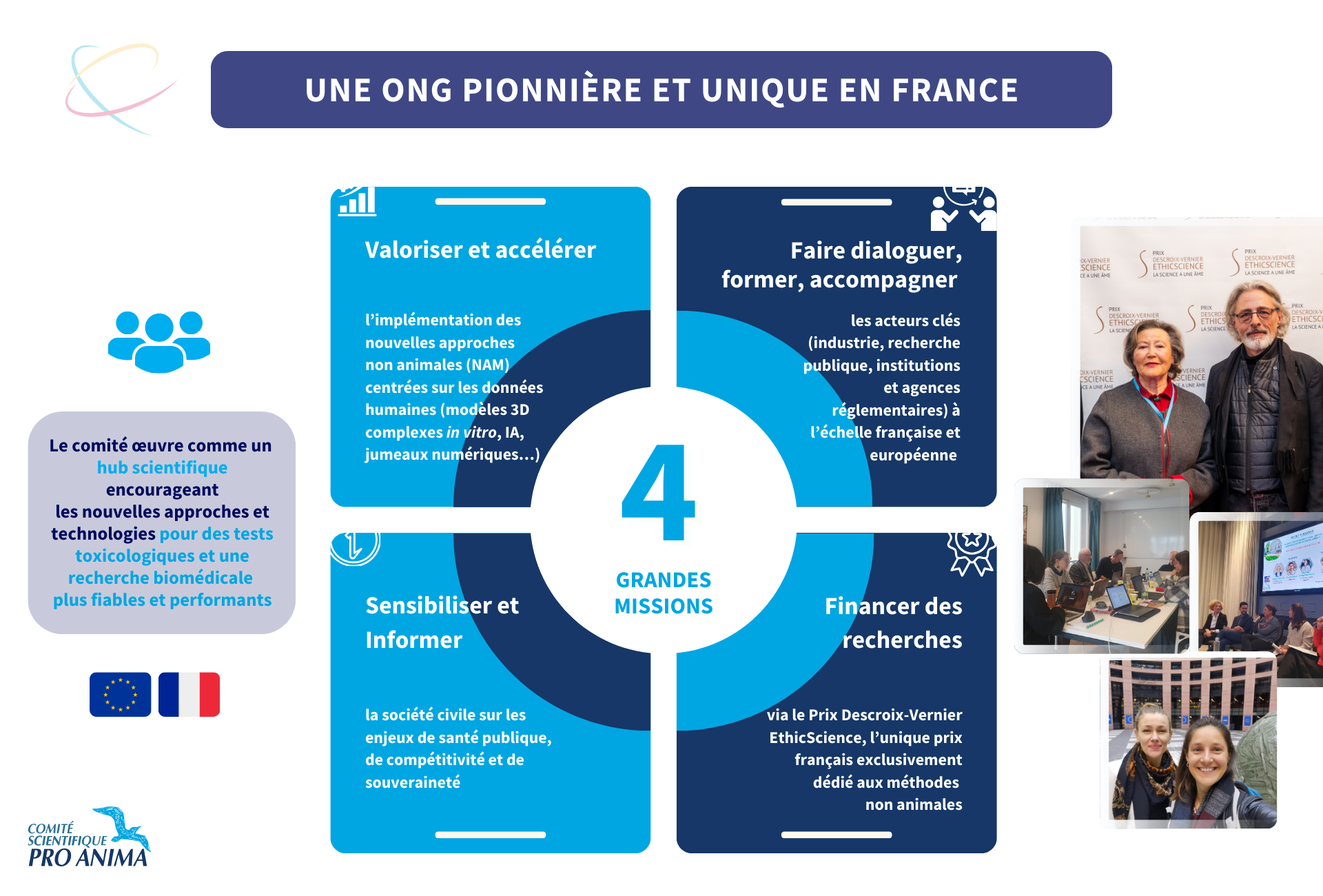 Créé en 1989 sous la présidence d’honneur du Professeur Théodore Monod, le Comité scientifique Pro Anima (du latin le souffle, la vie, l’âme) est un conseil formé de scientifiques, d’universitaires et de membres du corps médical, tous bénévoles, qui œuvrent avec des laboratoires partenaires au développement et à la promotion de programmes de recherche sans expérimenter sur les animaux.