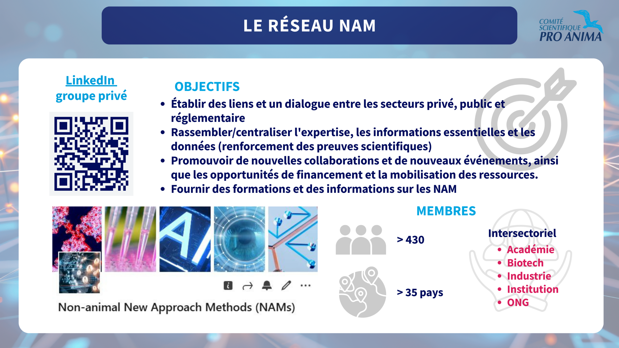 Ce réseau vise à rassembler toutes les personnes intéressées ou contribuant au domaine des méthodes alternatives aux animaux à des fins scientifiques (in vitro, in silico, etc) : chercheurs, ingénieurs, industriels, régulateurs et institutionnels. L’idée est de créer un large réseau afin de favoriser le dialogue entre les acteurs clés, partager les informations importantes, engendrer de nouvelles collaborations et rassembler des données scientifiques solides pour valider et promouvoir les méthodes alternatives à l’expérimentation animale.