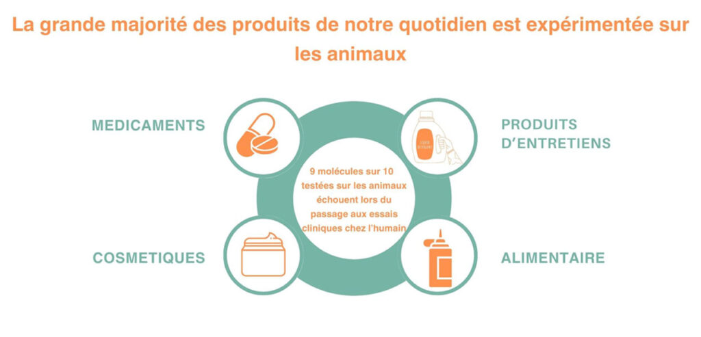 La grande majorité des produits de notre quotidien (médicaments, produits cosmétiques, d’entretien, alimentaires, etc) est expérimentée sur les animaux. Or, dans le cas des médicaments par exemple 9 molécules sur 10 pourtant testées sur les animaux échouent lors du passage aux essais cliniques chez l’humain.1